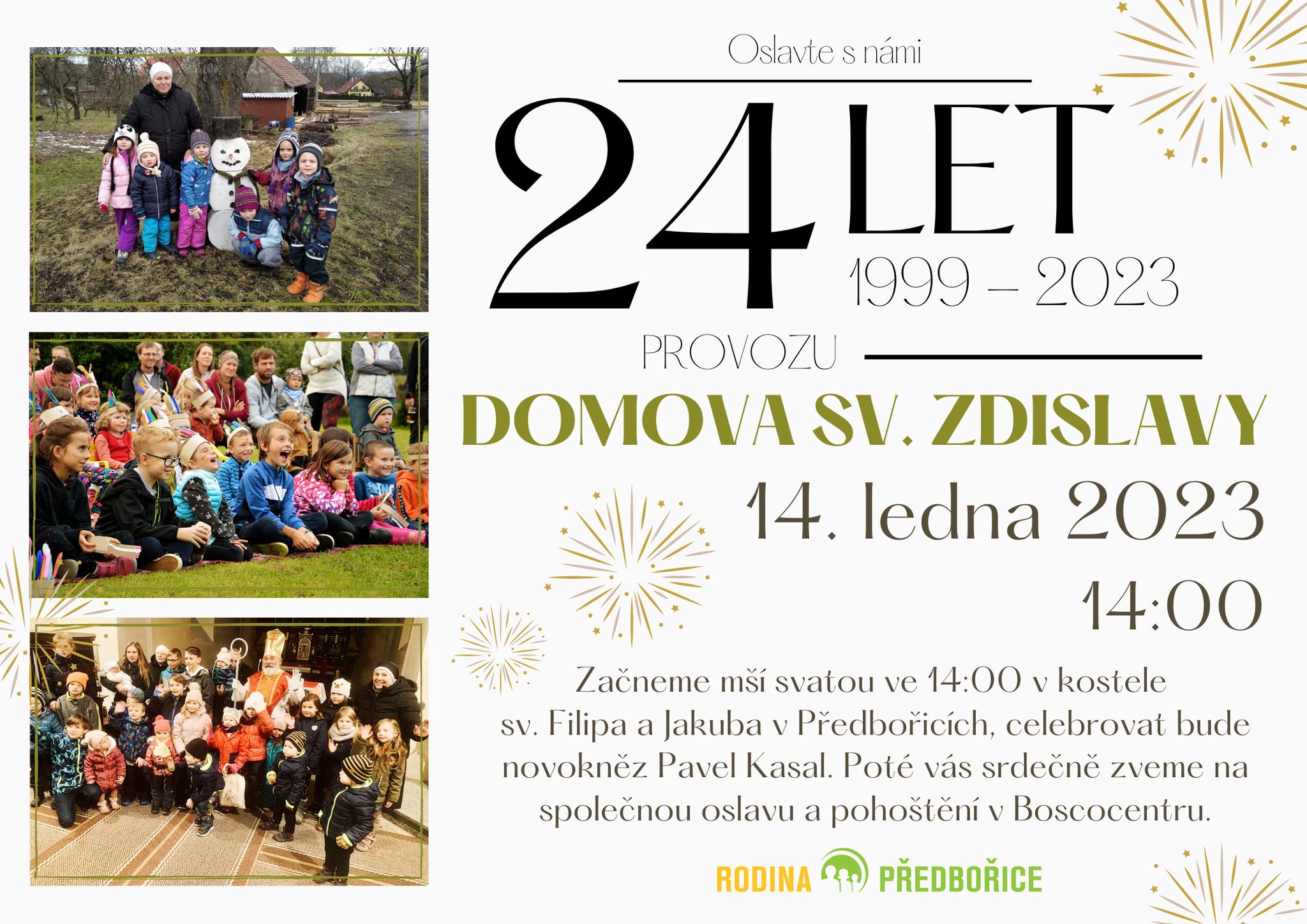 Rodina Předbořice Vás zve na oslavu 24 let provozu Domova sv. Zdislavy, a to 14. ledna 2023. Začne mší svatou od 14:00 v kostele sv. Filipa a Jakuba v Předbořicích. Celebrovat bude novokněz Pavel Kasal, proto bude možné po mši přijmout i novokněžské požehnání. Poté jste srdečně zváni na společnou oslavu a pohoštění v Boscocentru.
